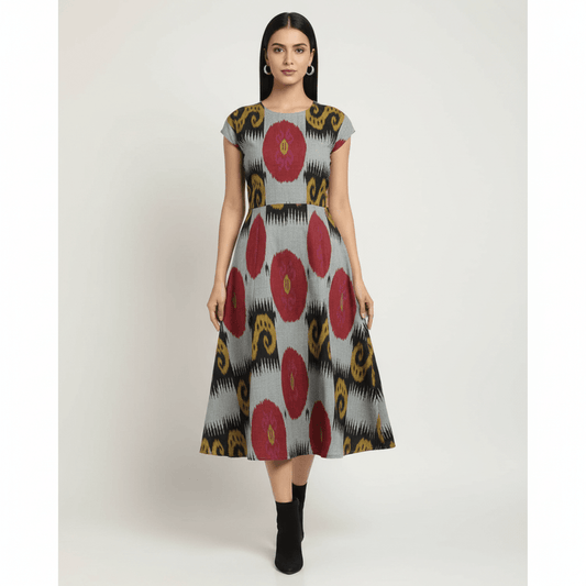 Grey Base Yellow, Red Big Pattern Fine Quality Cotton Handloom Ikat | SKU: IK-653