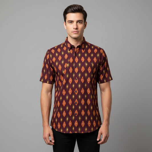 Multi Color Pattern on Maroon Base Fine Quality Cotton Handloom Ikat (Sku: IKK-414)
