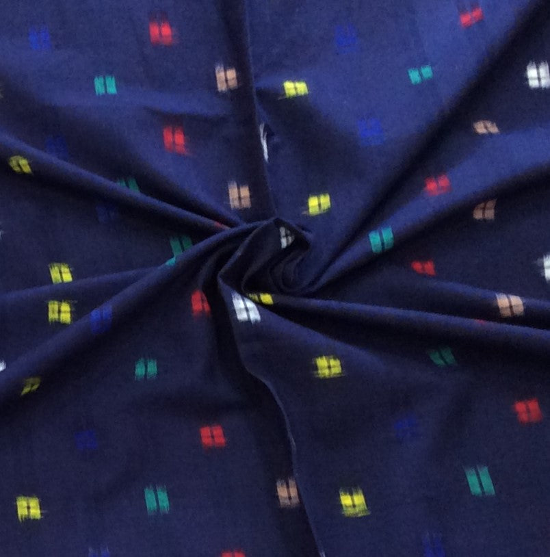 Blue Base Multicolor Squares Cotton Handwoven Double Ikat (Width: 44 inches or 112 cm)