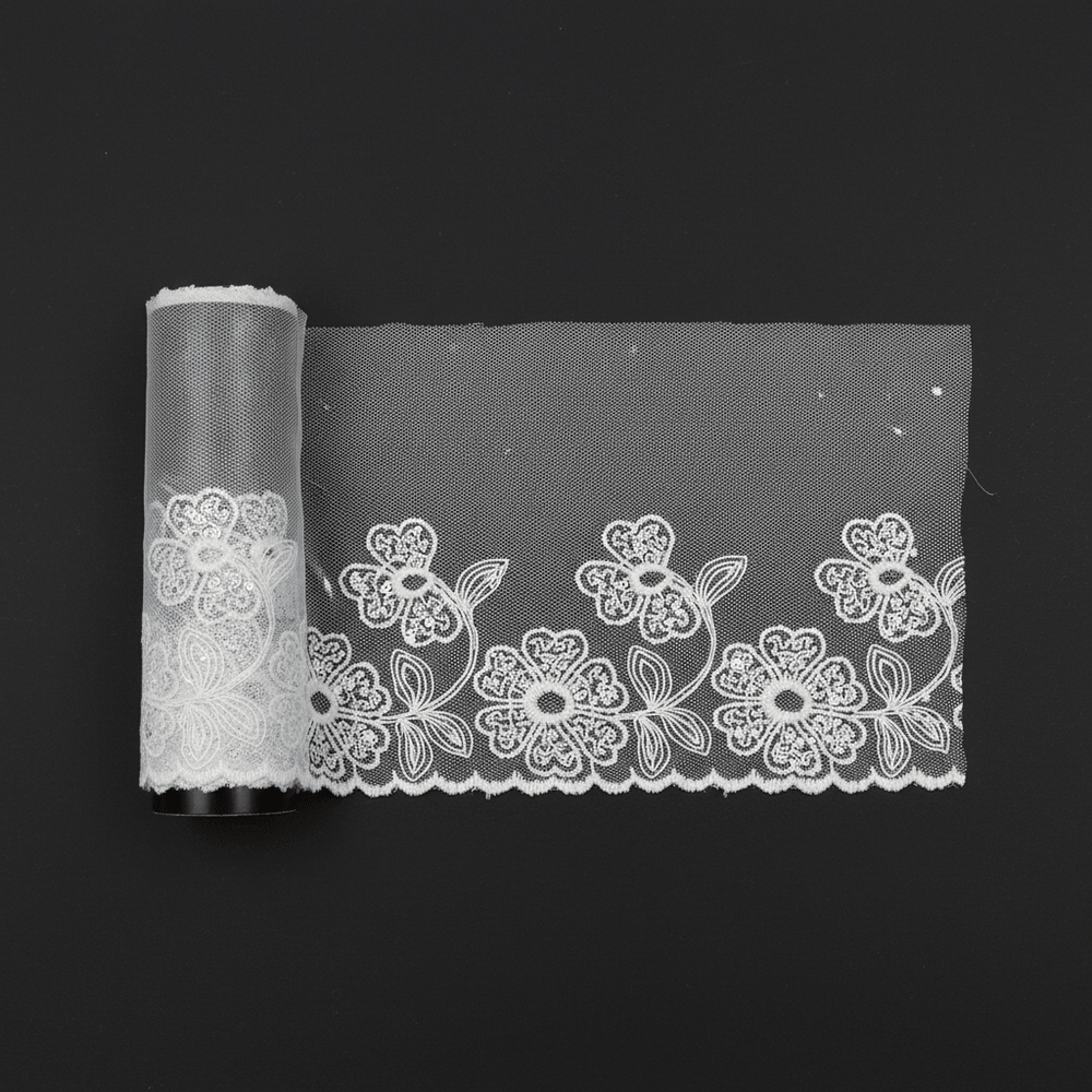 Nylon and net embroidered lace is a widely used embroidery lace fabric in the garment and textile industry. It is made by applying fine embroidery work on a nylon or net base, which gives the lace a lightweight structure along with good strength and durability. This type of lace provides an elegant and clean finish, making it suitable for both regular and designer garments.